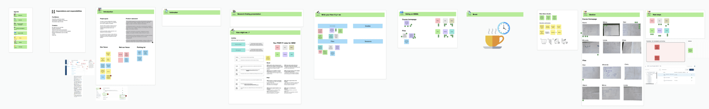 I facilitated and led an ideation session with the core team, using the "How Might We" framework to encourage creative problem-solving. The session focused on identifying and prioritising key opportunity areas, with particular emphasis on Files, Sessions, and Courses, to align efforts with user needs and business goals.